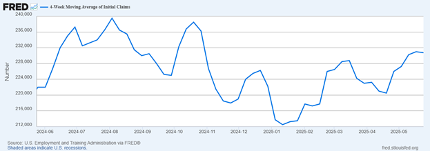 The fact that the FED has been zeroing in on its PCE goal but has not yet cut rates – or signaled that cuts will come soon – tells us that it values labor over inflation. Some prominent analysts believe that the FED will begin cutting rates once the 4-week moving average of Initial Jobless Claims reaches 323,000. As you can see, we’re not quite there yet: