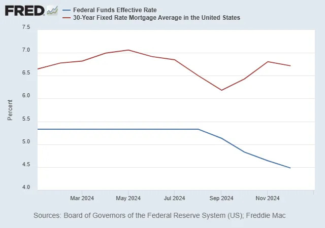 Check out the chart below, which tracks the Federal Fuds Effective Rate (blue) vs. the 30-Year Fixed average mortgage rate (red). You’ll see that since last August, when the FED began cutting rates, mortgage rates have increased. The economy, the labor market, and inflation are driving rates more than the FED right now!
